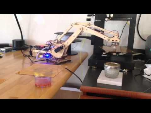 The original idea was a desktop robotic arm that could load and unload a queue of jobs for the 3D printer. Lost time at night or while busy with something else could be recuperated -- the limiting factor would now become the human designer queuing enough jobs!